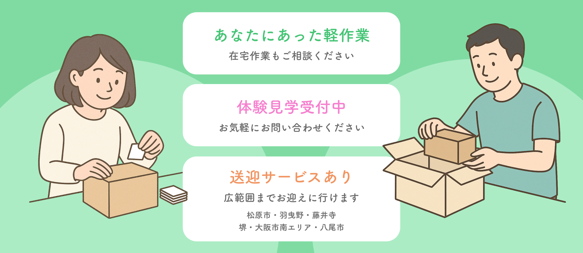 軽作業・在宅ワーク・送迎サービスにより、ご自身のペースで働きたい方を丁寧にサポートします。
